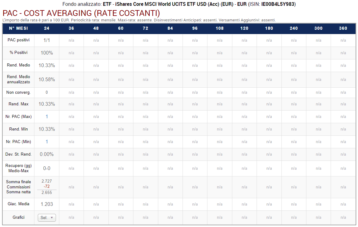- La somma finale generata dal PAC (2.727 euro), le commissioni totali pagate (72 euro, ovvero 3 euro per ognuna delle 24 rate versate) e la somma netta (2.655 euro, pari alla differenza dei due precedenti valori).