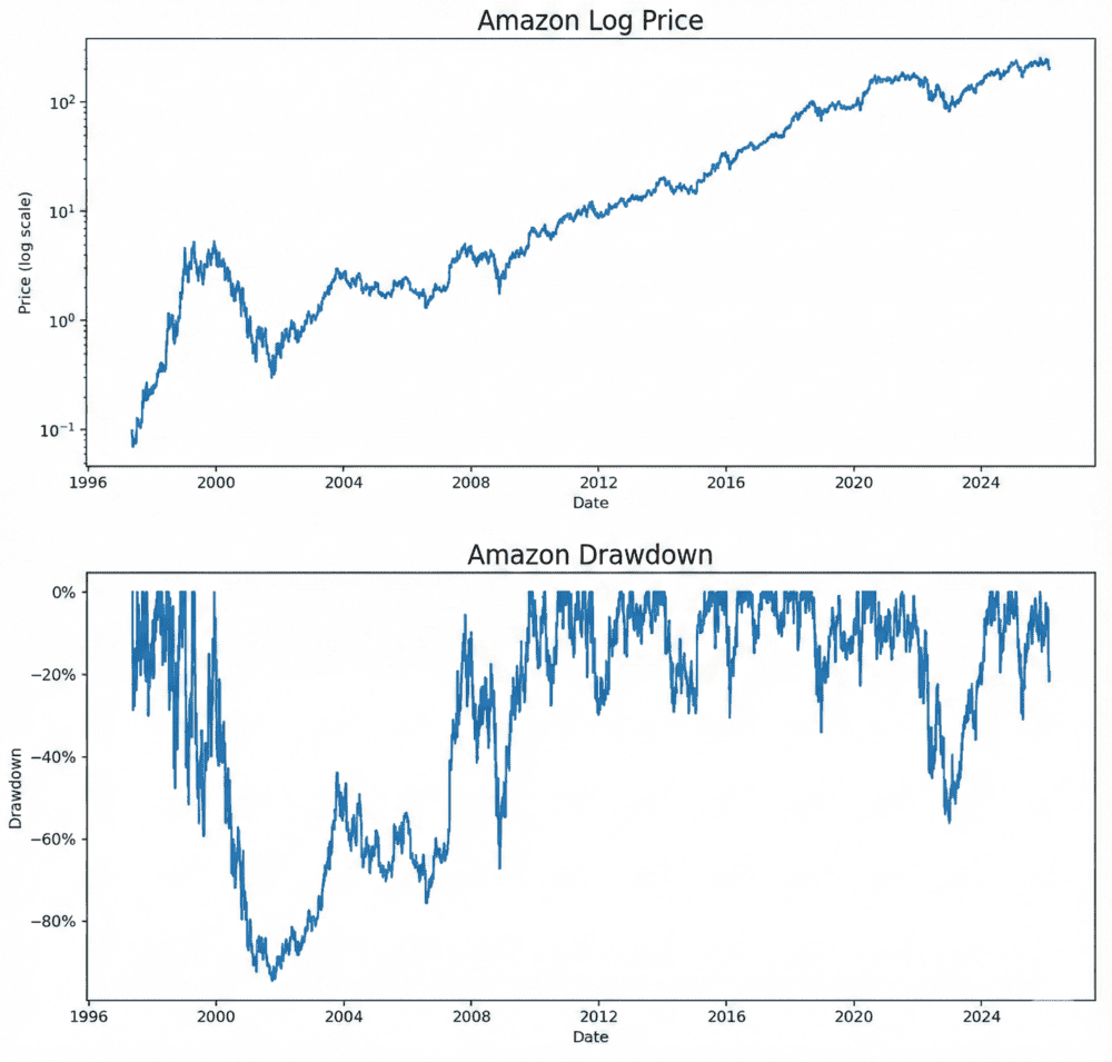Ad esempio, questi sono i grafici dell’andamento del prezzo e dei drawdown di Amazon: