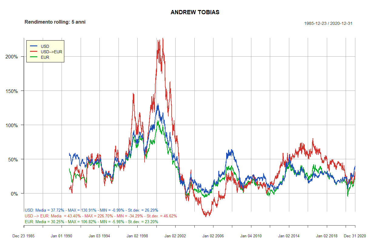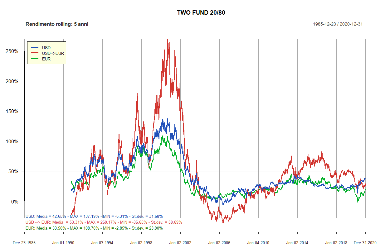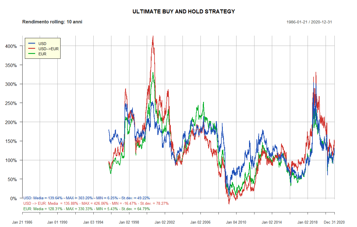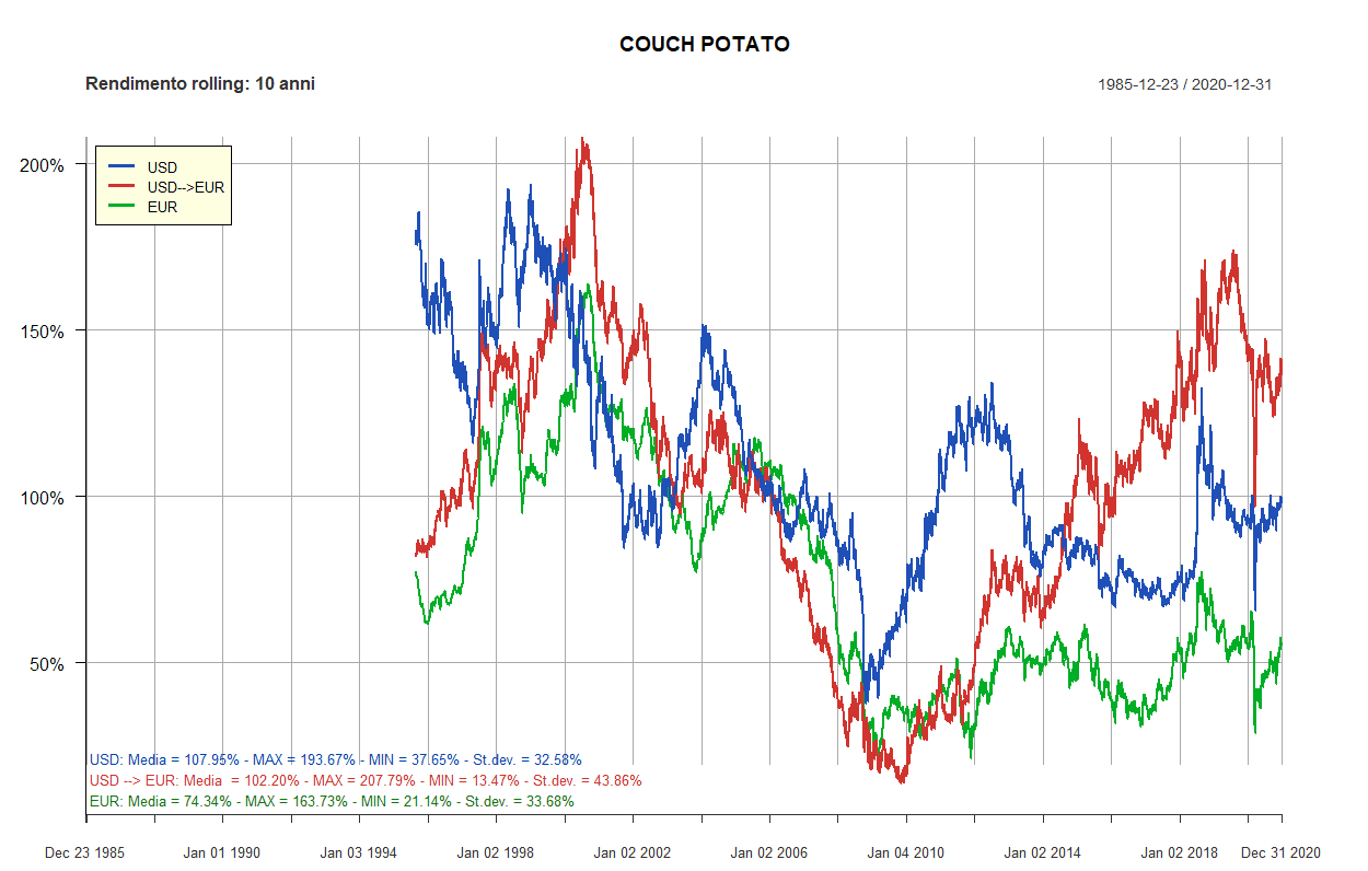 - Backtestando i Lazy portfolios originali in USD, in USD→EUR (applicando la conversione in base ai valori giornalieri del tasso di cambio) e in EUR: una versione creata appositamente per gli investitori dell'area euro.