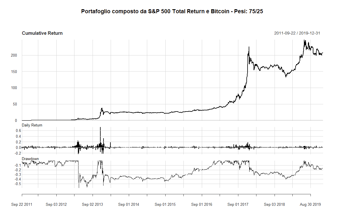 - Ovviamente, il processo inverso avrebbe prodotto un risultato diverso: partendo da un portafoglio di soli Bitcoin, la diversificazione con l'asset azionario ne avrebbe diminuito la volatilità. Purtroppo però, il caso di maggiore interesse – almeno per gli investitori con un orizzonte temporale di lungo termine – è quello che abbiamo analizzato: inserire una piccola quantità di Bitcoin in un portafoglio azionario.