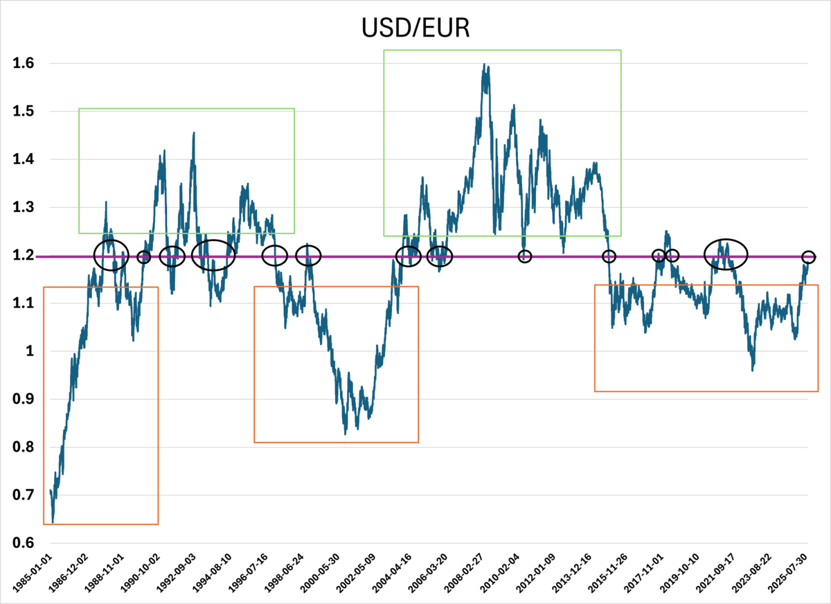 L’obiettivo di questo articolo non è quello di fornire previsioni sui movimenti futuri delle valute o di proporre strategie operative particolari. Intende, piuttosto, offrire alcuni spunti di riflessione: spiegare perché affidarsi all’idea che la regressione verso la “media storica” del cambio risolva il problema sia fuorviante, e mostrare come il rischio valutario resti una variabile concreta, in grado di influenzare la volatilità e altre misure di rischio, anche quando a prima vista sembrerebbe irrilevante.
